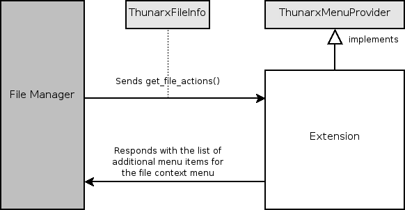 The extensions interact with the file manager by implementing so called providers. This is a concept adopted from the Nautilus Extension Framework.